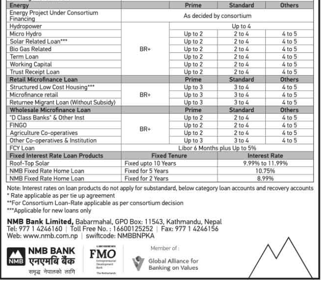 काठमाडौं । एनएमबि बैंकले नयाँ ब्याजदर सार्वजनिक गरेको छ । बैंकले आज भदौ १० गते देखि लागु हुने गरि कर्जा र निक्षेप दुवै तर्फको ब्याजदर सार्वजनिक गरेको हो ।