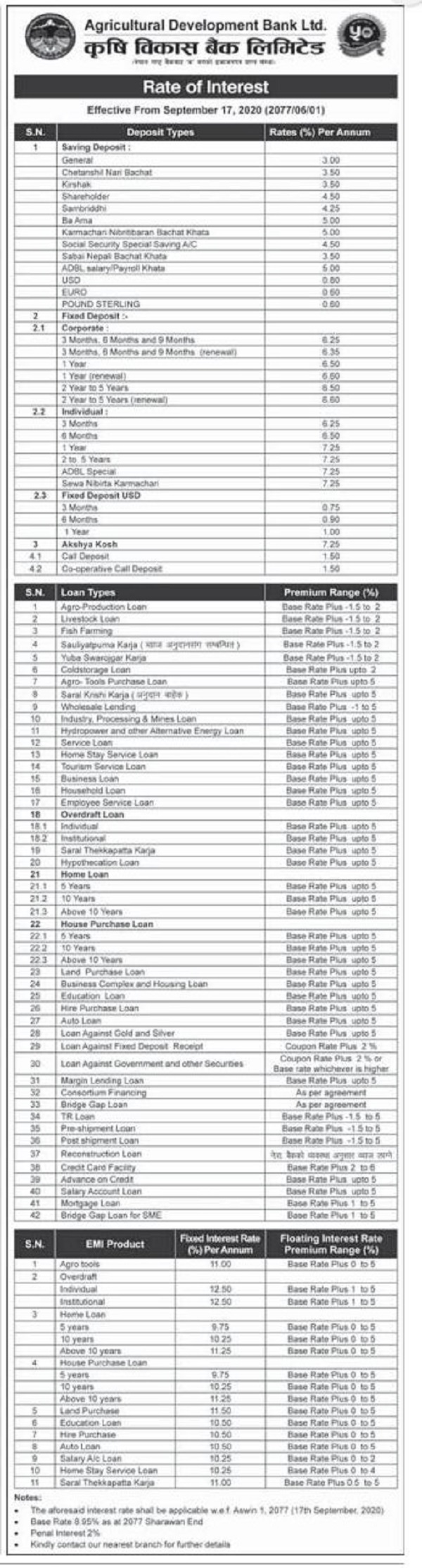 काठमाडौं । कृषि विकास बैंकले नयाँ ब्याजदर घोषणा गरेको छ । बैंकले आज असोज १ गते बिहीबारदेखि लागू हुनेगरी नयाँ ब्याजदर सार्वजनिक गरेको हो ।