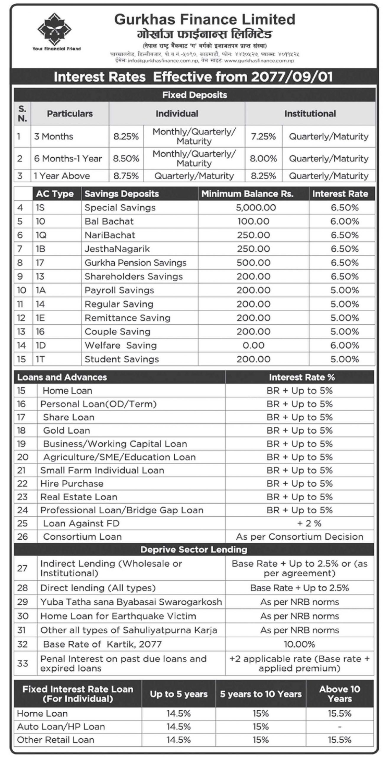 काठमाडौं । गोर्खाज फाइनान्स लिमिटेडले नयाँ व्याजदर सार्वजनिक गरेको छ । फाइनान्स कम्पनीले विभिन्न खातामा पौष १ गतेबाट लागू हुने गरी नयाँ व्याजदर प्रकाशन गरेको जनाएको छ ।
