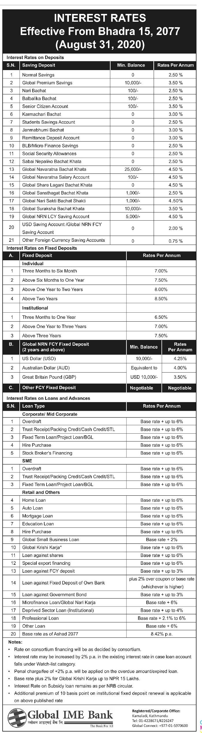 काठमाडौं । ग्लोबल आइएमई बैंकले नयाँ ब्याजदर सार्वजनिक गरेको छ । बैंकले भदौ १५ गतेदेखि लागु हुने गरी बचत तथा कर्जा तर्फको नयाँ ब्याजदर सार्वजनिक गरेको हो ।