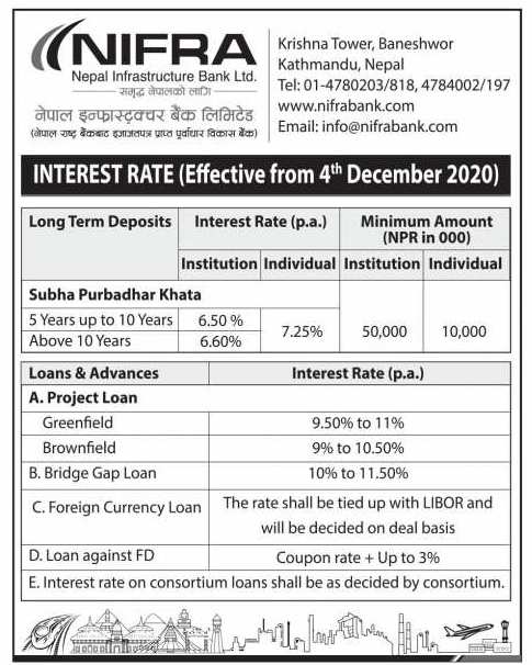 काठमाडौं । नेपाल इन्फ्रास्ट्रक्चर बैंक लिमिटेडले नयाँ व्याजदर सार्वजनिक गरेको छ । बैंकले विभिन्न खातामा आज मंसिर १९ गते, शुक्रबारबाट लागू हुने गरी नयाँ व्याजदर सार्वजनिक गरेको हो ।