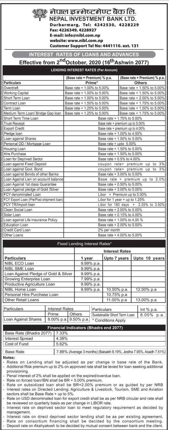 काठमाडौं । नेपाल इन्भेष्टमेन्ट बैंक लिमिटेडले नयाँ व्याजदर सार्वजनिक गरेको छ । बैंकले विभिन्न खातामा आजदेखि लागू हुने गरी नयाँ व्याजदर प्रकाशन गरेको हो ।