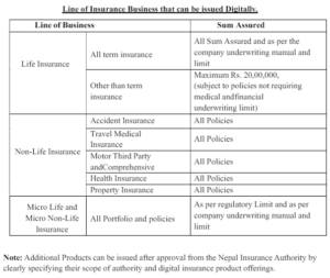 प्राधिकरणले डिजिटल माध्यमबाट जारी हुने बीमालेखका लागि जीवन बीमा, निर्जीवन बीमा र लघु जीवन र निर्जीवन बीमा कम्पनीलाई मापदण्ड तोकिएको छ। त्यस्तै प्राधिकरणको स्वीकृतिमा बीमकले नयाँ प्रडक्ट पनि डिजिटल माध्यमबाट जारी गर्न पाउने भएका छन्।