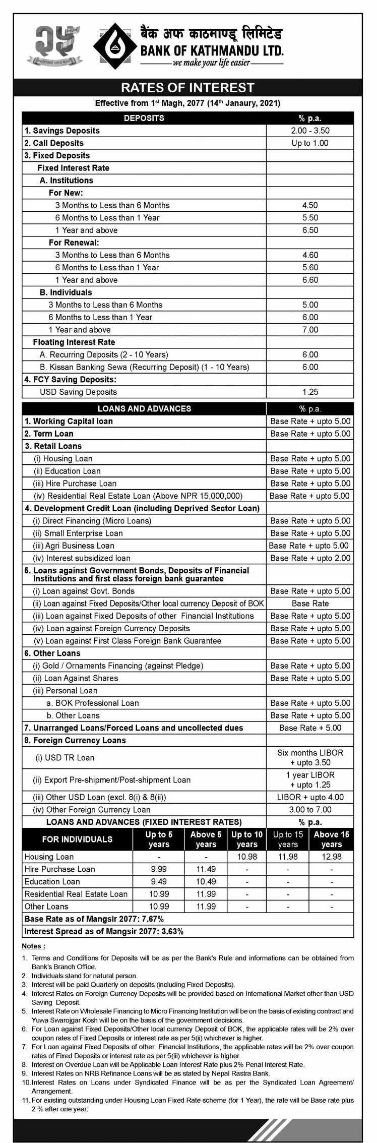 काठमाडौँ । बैंक अफ काठमाण्डू लिमिटेडले नयाँ व्याजदर प्रकाशन गरेको छ । बैंकले निक्षेप, कर्जा तथा मुद्धती निक्षेप खातामा नयाँ ब्याजदर प्रकाशन गरेको हो । बैंकले आज माघ १ गते, बिहीबारबाट लागू हुने गरी नयाँ व्याजदर सार्वजनिक गरेको एक सुचना मार्फत जनाएको छ ।