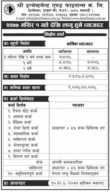 काठमाडौं । श्री इन्भेष्टमेन्ट एण्ड फाइनान्स लिमिटेडले नयाँ व्याजदर सार्वजनिक गरेको छ । फाइनान्सले विभिन्न खातामा मंसिर १ गते सोमबारबाट लागू हुने गरी नयाँ व्याजदर सार्वजनिक गरेको हो ।
