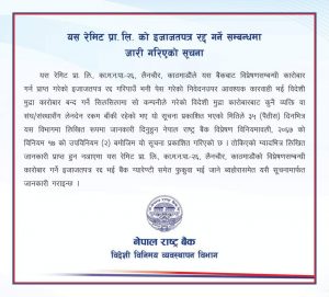 काठमाडौं । यस रेमिट प्रा.लिको इजाजतपत्र रद्ध हुने भएको छ । कम्पनीले इजाजतपत्र रद्ध गरी पाउँ भनि नेपाल राष्ट्र बैंकको विदेशी विनिमय व्यवस्थापन विभागमा परेको निवेदन अनुसार इजाजत पत्र रद्ध हुने भएको हो ।