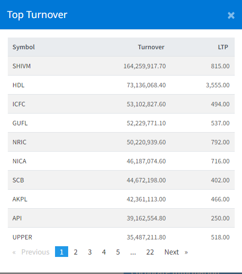 सर्वाधिक धेरै कारोबार हुने कम्पनीहरुमा क्रमश गुराँस फाइनान्स, नेपाल पुनर्बीमा, एनआईसी एशिया बैंक, स्ट्याण्डर्ड चार्टर्ड बैंक, अरुण काबेली, अपि पावर र अपर तामाकोशी छन् ।