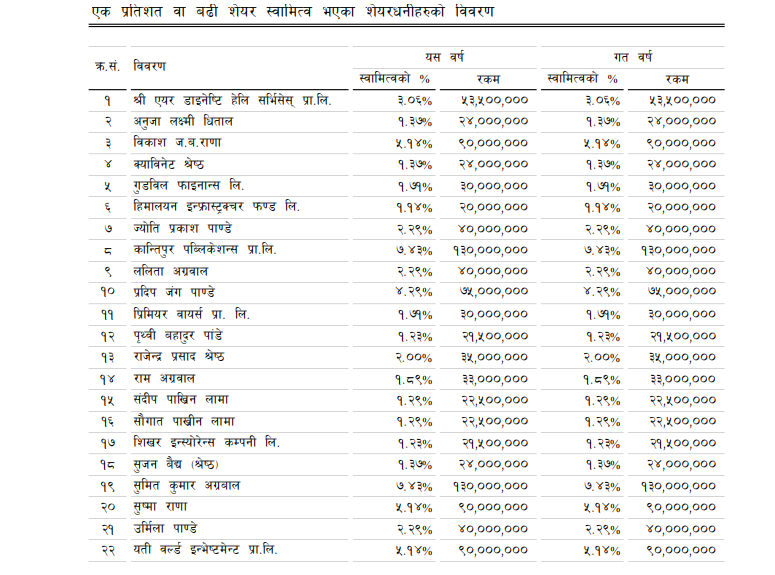 शिखर इन्स्योरेन्सको १.२३ प्रतिशत लगानी रहेको छ । ज्यती प्रकाश पाण्डेको २.२९ प्रतिशत रहेको छ भने पृथ्वी बहादुर पाँडेको १.२३ प्रतिशत छ । उर्मिला पाण्डेको २.२९ प्रतिशत छ । सुरज वैद्यको १.३७ प्रतिशत, श्री एयर डाइनेष्टि हेलि सर्भिसेस प्रालिको ३.०६ प्रतिशत, अनुजा लक्ष्मी धितालको १.३७ प्रतिशत, क्याविनेट श्रेष्ठको १.३७ प्रतिशत, गुडविल फाइनान्सको १.७१ प्रतिशत, हिमालयन इन्फ्रास्ट्रक्चर एण्ड लिको १.१४ प्रतिशत, ललिता अग्रवालको २.२९ प्रतिशत, प्रदिप जंग पाण्डेको ४.२९ प्रतिशत, प्रिमियर वायर्सको १.७१ प्रतिशत लगानी छ ।