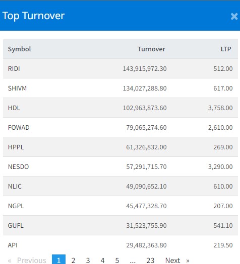 आज सबैभन्दा धेरै रिडी पावर कम्पनीको १४ करोड ३९ लाख रुपैयाँको शेयर कारोबार भएको छ । शिवम् सिमेन्टको १३ करोड ४० लाख रुपैयाँको शेयर कारोबार भएको छ । हिमालयन डिष्टिलरीको १० करोड २९ लाख रुपैयाँको शेयर कारोबार भएको छ । फरवार्ड माइक्रोफाइनान्सको ७ करोड ९० लाख रुपैयाँको शेयर कारोबार भएको छ ।