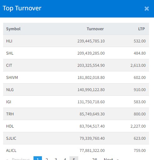 आज ४ अर्ब ५ करोड १ लाख रुपैयाँको शेयर कारोबार हुँदा सबैभन्दा धेरै हिमालयन लाइफ इन्स्योरेन्स कम्पनीको शेयर कारोबार भएको छ । आज कम्पनीको २३ करोड ९४ लाख रुपैयाँको शेयर कारोबार भएको छ । आज कम्पनीको शेयर मुल्य ५३२ रुपैयाँ रहेको छ ।