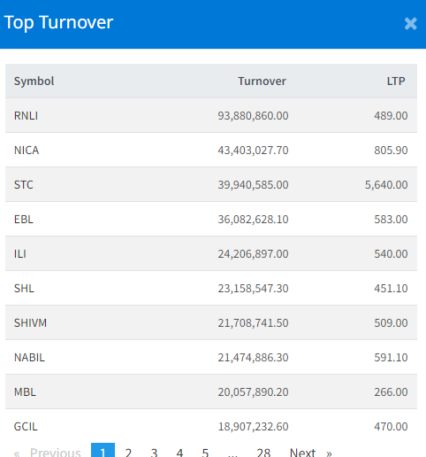 आज ८७ करोड ४ लाख रुपैयाँको शेयर कारोबार हुँदा सबैभन्दा धेरै रिलायबल नेपाल लाइफको शेयर कारोबार भएको छ । आज कम्पनीको ९ करोड ३८ लाख रुपैयाँको शेयर कारोबार भएको छ । एनआइसी एशिया बैंकको ४ करोड ३४ लाख रुपैयाँको शेयर कारोबार भएको छ । साल्ट ट्रेडिङको ३ करोड ९९ लाख रुपैयाँको शेयर कारोबार भएको छ । एभरेष्ट बैंकको ३ करोड ६० लाख रुपैयाँको शेयर कारोबार भएको छ ।