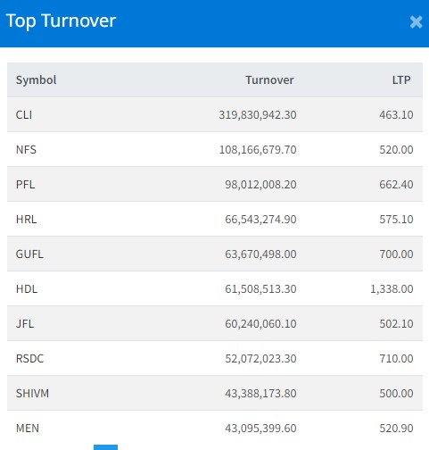 आज ६९ लाख ७८ हजार ३२१ कित्ता शेयर किनबेच हुँदा २ अर्ब ८९ करोड १३ लाख रुपैयाँको शेयर कारोबार भएको छ । आज सबैभन्दा धेरै सिटिजन लाइफ इन्स्योरेन्स कम्पनीको शेयर कारोबार भएको छ । आज यस कम्पनीको ३१ करोड ९८ लाख रुपैयाँको शेयर कारोबार भएको छ । नेपाल फाइनान्सको १० करोड ८१ लाख रुपैयाँको शेयर कारोबार भएको छ । पोखरा फाइनान्सको ९ करोड ८० लाख रुपैयाँको शेयर कारोबार भएको छ । हिमालयन रिइन्स्योरेन्सको ६ करोड ६५ लाख रुपैयाँको शेयर कारोबार भएको छ ।