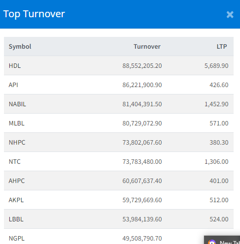 त्यस्तै, अपि पावर कम्पनीको ८ करोड ६२ लाख रुपैयाँको शेयर कारोबार भएको छ । आज कम्पनीको ४२६ रुपैयाँ शेयर मुल्य कायम भएको छ । नविल बैंकको ८ करोड १४ लाख रुपैयाँको शेयर कारोबार भएको छ । कम्पनीको शेयर मुल्य १४ सय ५२ रुपैयाँ कायम भएको छ । महालक्ष्मी विकास बैंकको ८ करोड ७ लाख रुपैयाँको शेयर कारोबार भएको छ । नेशनल हाइड्रोपावर कम्पनीको ७ करोड ३८ लाख रुपैयाँको शेयर कारोबार भएको छ ।