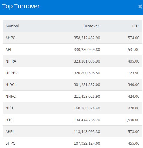 आज सबेभन्दा धेरै अरुण भ्याली हाइड्रोपावर कम्पनीको शेयर कारोबार भएको छ । कम्पनीको ३५ करोड ८५ लाख रुपैयाँको शेयर कारोबार भएको छ । अपि पावर कम्पनीको ३३ करोडमाथिको शेयर कारोबार भएको छ । कम्पनीको शेयर मुल्य ५३१ रुपैयाँ कायम भएको छ । निफ्राको ३२ करोड ३३ लाख रुपैयाँको शेयर कारोबार भएको छ । कम्पनीको शेयर मुल्य ४०५ रुपैयाँ कायम भएको छ । अपर तामाकोशीको ३२ करोडमाथिको शेयर कारोबार भएको छ ।