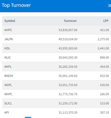त्यस्तै, जाल्पा लघुवित्तको ४ करोड ९४ लाख रुपैयाँको शेयर कारोबार भएको छ । हिमालयन डिष्टिलरीको ४ करोड ३९ लाख रुपैयाँको शेयर कारोबार भएको छ । नेपाल लाइफको ३ करोड ९० लाख रुपैयाँको शेयर कारोबार भएको छ । अरुण कावेली पावरको ३ करोड ६२ लाख रुपैयाँको शेयर कारोबार भएको छ ।