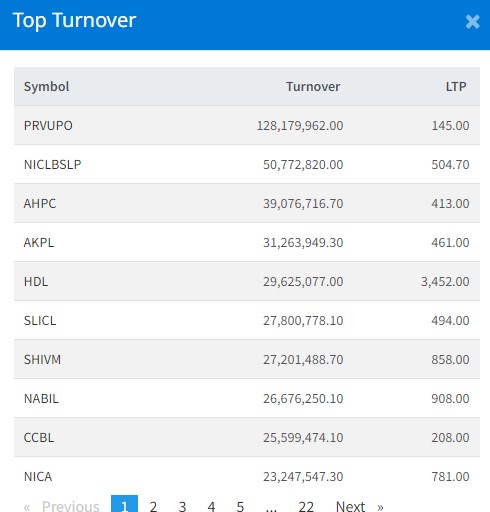 त्यस्तै, एनआइसी एशिया लघुवित्त प्रोमोटर शेयर ५ करोड ७ लाख रुपैयाँको कारोबार भएको छ । अरुण भ्याली हाइड्रोपावर कम्पनीको ३ करोड ९० लाख रुपैयाँको शेयर कारोबार भएको छ । अरुण कावेली पावर कम्पनीको ३ करोड १२ लाख रुपैयाँको शेयर कारोबार भएको छ । हिमालयन डिष्टिलरीको २ करोड ९६ लाख रुपैयाँको शेयर कारोबार भएको छ ।
