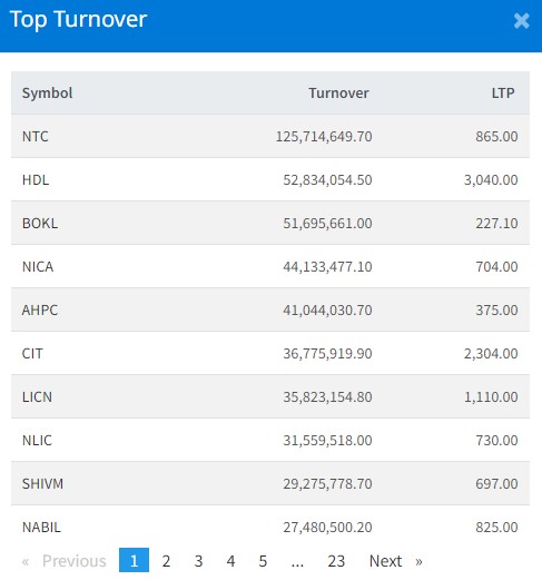 त्यस्तै, हिमालयन डिष्टिलरीको ५ करोड २८ लाख रुपैयाँको शेयर कारोबार भएको छ । बैंक अफ काडमाण्डूको ५ करोड १६ लाख रुपैयाँको शेयर कारोबार भएको छ । एनआइसी एशिया बैंकको ४ करोड ४१ लाख रुपैयाँको शेयर कारोबार भएको छ । अरुण भ्याली हाइड्रोपावर कम्पनीको ४ करोड १० लाख रुपैयाँको शेयर कारोबार भएको छ ।
