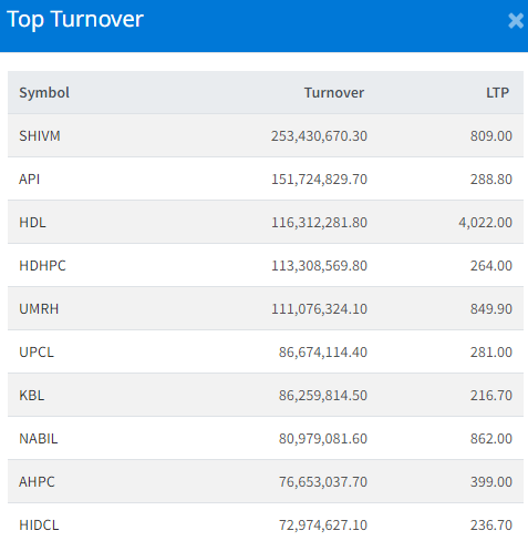 आज ४ अर्ब २ करोड ९९ लाख रुपैयाँको शेयर कारोबार हुँदा सबैभन्दा धेरै शिवम् सिमेन्टको कारोबार भएको छ । कम्पनीको २५ करोड ३४ लाख रुपैयाँको शेयर कारोबार भएको छ । अपि पावरको १५ करोड १७ लाख, हिमालयन डिष्टिलरीको ११ करोड ६३ लाख रुपैयााको शेयर कारोबार भएको छ ।