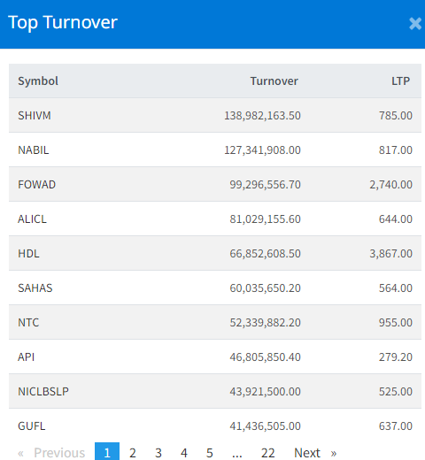 आज दिनभरिमा २१९ कम्पनीको ६१ लाख ६ हजार ५२१ कित्ता शेयर किनबेच हुँदा २ अर्ब ६७ करोड ३३ लाख रुपैयाँको शेयर कारोबार भएको छ । आज सबैभन्दा धेरै शिवम् सिमेन्टको कारोबार भएको छ । कम्पनीको १३ करोड ८९ लाख रुपैयाँको शेयर कारोबार भएको छ ।