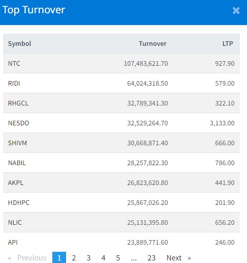 आज १ अर्ब १२ करोड ६२ लाख १७ हजार रुपैयाँको शेयर कारोबार हुँदा आज सबैभन्दा धेरै नेपाल टेलिकमको शेयर कारोबार भएको छ । आज टेलिकमको १० करोड ७४ लाख रुपैयाँको शेयर कारोबार भएको छ ।आज रिडी पावर कम्पनीको ६ करोड ४० लाख रुपैयाँको शेयर कारोबार भएको छ । राप्ती हाइड्रो एण्ड जनरल कन्ट्रसनको ३ करोड २७ लाख रुपैयाँको शेयर कारोबार भएको छ । नेष्डो समृद्ध लघुवित्तको ३ करोड २५ लाख रुपैयाँको शेयर कारोबर भएको छ ।