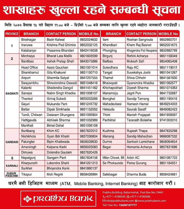 यी हुन् आज प्रभु बैंकको खुला रहने शाखा कार्यालयहरु