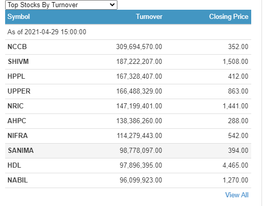 आज ४ अर्ब ३५ करोड ७० लाख १९ हजार रुपैयाँको शेयर कारोबार हुँदा एनसीसी बैंकको ३० करोड ९६ लाख ९४ हजार रुपैयाँको शेयर करोबार भएको छ । त्यस्तै, शिवम् सिमेन्टको १८ करोड ७२ लाख रुपैयाँको शेयर कारोबार भएको छ ।