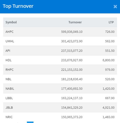 त्यस्तै, यूनाइटेड मोदी हाइड्रोपावर कम्पनीको ३० करोड १४ लाख रुपैयाँको शेयर कारोबार भएको छ । अपी पावरको २३ करोड ७५ लाख रुपैयाँको शेयर कारोबार भएको छ । हिमालयन डिस्टीलरीको २३ करोड ३६ लाख रुपैयाँको शेयर कारोबार भएको छ । रिडी हाइड्रोपावर कम्पनीको २२ करोड ११ लाख रुपैयाँको शेयर कारोबार भएको छ ।