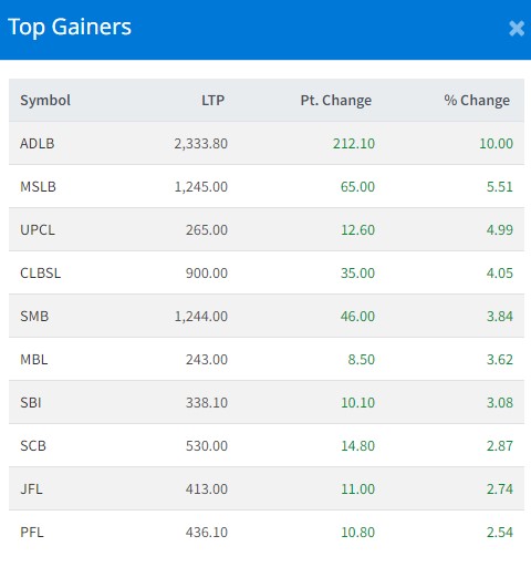 आज सबैभन्दा धेरै आदर्श लघुवित्त वित्तीय संस्थाका लगानीकर्ताले कमाएका छन् । यस कम्पनीका लगानीकर्ताले १० प्रतिशतका दरले कमाएका छन् । महुली लघुवित्त वित्तीय संस्थाका लगानकिर्ताले ५ दशमलव ५१ प्रतिशतका दरले कमाएका छन् । युनिभर्सल पावर कम्पनीका लगानकिर्ताले ४ दशमलव ९९ प्रतिशतका दरले कमाएका छन् ।