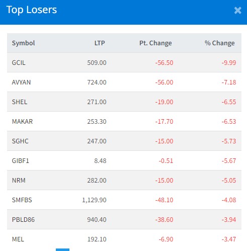 आज सबैभन्दा धेरै घोराही सिमेन्टका लगानीकर्ताले गुमाएका छन् । आज यस कम्पनीका लगानीकर्ताले ९ दशमलव ९९ प्रतिशतका दरले गुमाएका हुन् । अभियान लघुवित्तका लगानीकर्ताले ७ प्रतिशतका दरले गुमाएका हुन् ।