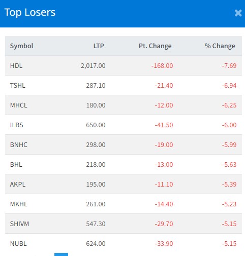 आज सबैभन्दा धेरै हिमालयन डिष्टिलरीका लगानीकर्ताले गुमाएका छन् । आज यसका लगानीकर्ताले ७ दशलमव ६९ प्रतिशतका दरले गुमाएका हुन् । थ्रि स्टार हाइड्रोपावरका लगानीकर्ताले ६ प्रशिततका दरले गुमाएका हुन् ।