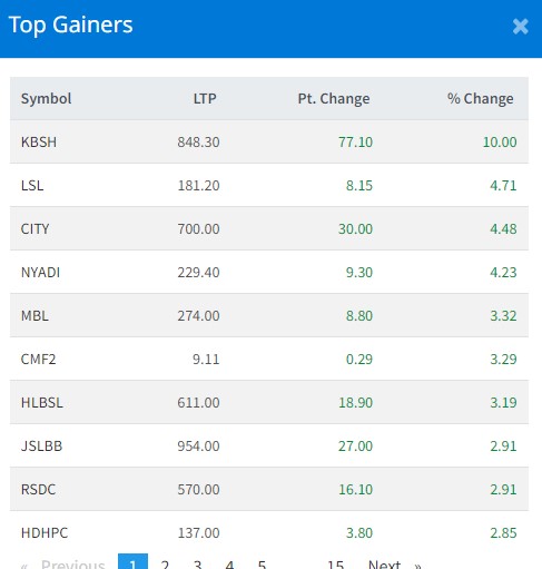 आज सबैभन्दा धेरै कुथेली बुखरीका लगानीकर्ताले कमाएका छन् । आज यस कम्पनीका लगानीकर्ताले १० प्रतिशतका दरले कमाएका हुन् । लक्ष्मी सनराइज बैंकका लगानीकर्ताले ४ दशमलव ७१ प्रतिशतका दरले कमाएका छन् । सिटि होटलका लगानीकर्ताले ४ दशलमव ४८ प्रतिशतका दरले कमाएका हुन् ।