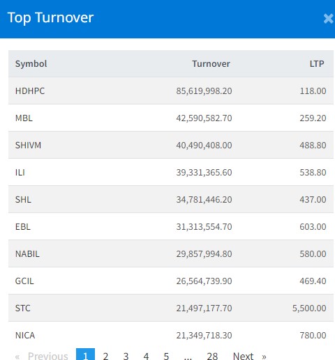 आज १ अर्ब ७ करोड २२ लाख १२ हजार रुपैयाँको शेयर कारोबार हुँदा सबैभन्दा धेरै हिमाल दोलखा हाइड्रोपावर कम्पनीको शेयर कारोबार भएको छ । आज कम्पनीको ८ करोड ५६ लाख रुपैयाँको शेयर कारोबार भएको छ । माछापुच्छ्रे बैंकको ४ करोड २५ लाख रुपैयाँको शेयर कारोबार भएको छ । त्यस्तै, शिवम् सिमेन्टको ४ करोड ४ लाख रुपैयाँको शेयर कारोबार भएको छ । आइएमई लाइफको ३ करोड ९३ लाख रुपैयाँको शेयर कारोबार भएको छ । सोल्टी होटलको ३ करोड ४७ लाख रुपैयाँको शेयर कारोबार भएको छ ।
