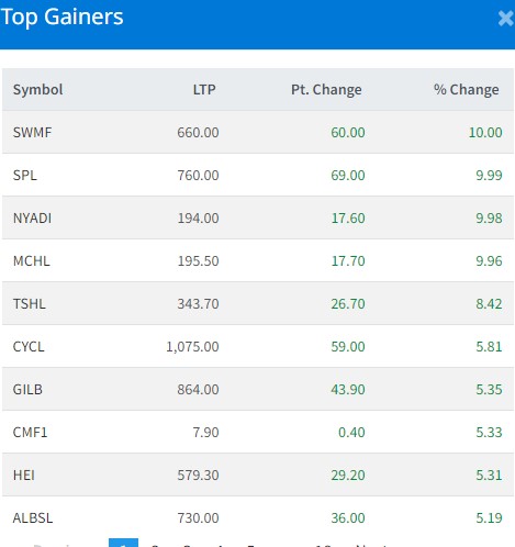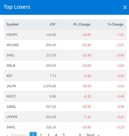 आज सबैभन्दा धेरै हिमाल दोलखा हाइड्रोपावर कम्पनीका लगानीकर्ताले गुमाएका छन् । आज यस कम्पनीक ालगानीकर्ताले ७ दशलमव ८१ प्रतिशतका दरले गुमाएका हुन् ।