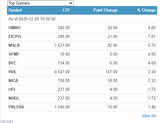 आज सबैभन्दा धेरै युनाइटेड इर्दि मर्दिका लगानीकर्ताले ९ दशमलव ९० प्रतिशतका दरले कमाएका छन् । एभरेष्ट इन्स्योरेन्स प्रोमोटर शेयर, महुली सामुदायिक लघुवित्त, सनराइज फर्स्ट म्युचुअल फण्ड, बेष्ट फाइनान्स लगायतका लगानीकर्ताले कमाएका छन् ।