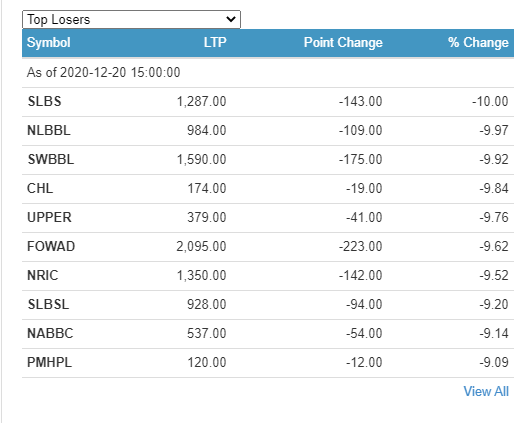 आज सबैभन्दा धेरै सुर्यादय लघुवित्तका लगानीकर्ताले १० प्रतिशतका दरले गुमाएका छन् । त्यस्तै, नेरुडे लघुवित्त, स्वाबलम्बन लघुवित्त, छ्याङदी हाइड्रोपावर, अपर तामाकोशी लगायतका लगानीकर्ताले गुमाएका छन् ।
