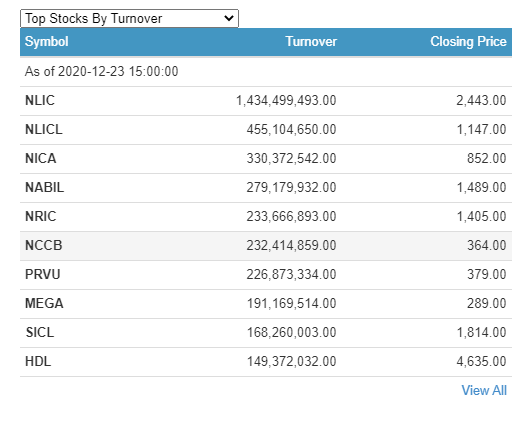 आज सबैभन्दा धेरै नेपाल लाइफको १ अर्ब ४३ करोडमाथिको करोबार भएको छ । नेशनल लाइफ इन्स्योरेन्स कम्पनीको ४५ करोड ५१ लाख रुपैयाँको शेयर कारोबार भएको छ । त्यस्तै, एनआइसी एशिया बैंकको ३३ करोडमाथि, नविल बैंकको २७ करोडमाथिको शेयर कारोबार भएको छ ।