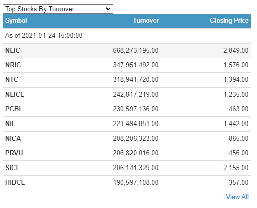 आज नेपाल लाइफको सर्वाधिक कारोबार भएको छ । कम्पनीको ६६ करोड ८२ लाख रुपैयाँको कारोबार भएको छ । त्यस्तै, नेपाल पुनर्बीमाको ३४ करोड ७९ लाख रुपैयाँ बराबरको कारोबार भएको छ। नेपाल टेलिकमको ३१ करोडमाथिको शेयर कारोबार भएको छ । नेशनल लाइफ इन्स्योरेन्सको २४ करोडमाथि, प्राइम कमर्सियल बैंकको २३ करोडमाथि, नेको इन्स्योरेन्सको २२ करोडमाथिको शेयर कारोबार भएको छ ।