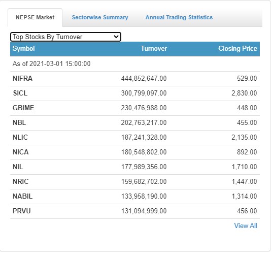 नेपाल इन्फ्रास्ट्रक्चर बैंक लिमिटेड (निफ्रा) ले सर्वाधिक कारोबार गर्न सफल भएको छ । कम्पनीको ४४ करोड ४८ लाख रुपैयाँको कारोबार भएको छ । त्यस्तै, शिखर इनस्योरेन्सको ३० करोड ७ लाख रुपैयाँ बराबरको कारोबार भएको छ।