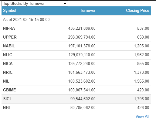 काठमाडौं । आज शेयर बजार १८ दशमलव ०४ अंकले घटेको छ । आज सबैभन्दा धेरै निफ्राको ४३ करोड ६२ लाख रुपैयाँको शेयर कारोबार भएको छ । आज कम्पनीको शेयर मुल्य २ दशमलव ६८ प्रतिशतले बढेर ५ सय ३७ रुपैयाँ कायम भएको छ । अपर तामाकोशीको २९ करोड ८३ लाख रुपैयाँको शेयर कारोबार भएको छ । आज कम्पनीको शेयर मुल्य १ दशमलव ८५ प्रतिशतले बढेर ६ सय ५९ रुपैयाँ कायम भएको छ ।