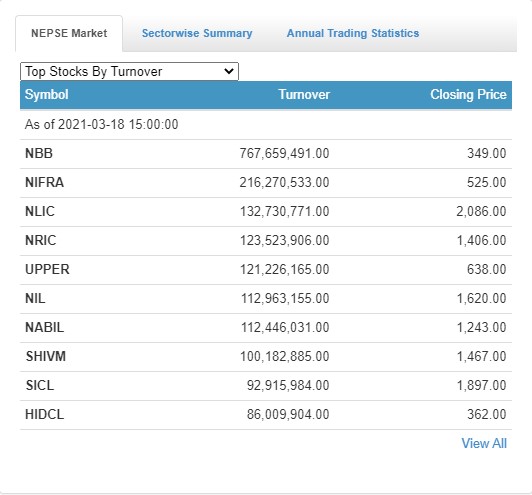 त्यस्तै, नेपाल लाइफ, नेपाल पुनर्बीमा कम्पनी, अपर तामाकोशी, नेको इन्स्योरेन्स, नबिल बैंक, शिव्म सिमेन्ट्स, शिखर इन्स्योरेन्स र हाईड्रो इलेक्टेसिटि इन्भेष्टमेन्ट एण्ड डेभलपमेन्टका लगानीकर्ताले सर्वाधिक कारोबार गरेका छन् ।