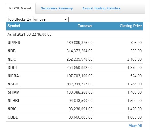त्यस्तै, नेपाल बंगलादेश बैंक, नेपाल लाइफ इस्योरेन्स, डिप्रोक्स लघुवित्त वित्तीय, निफ्रा, नबिल बैंक, शिवम् सिमेन्टस्, नेरुडे लघुवित्त र नेपाल पुनर्बीमा कम्पनीको सर्वाधिक कारोबार भएको छ ।