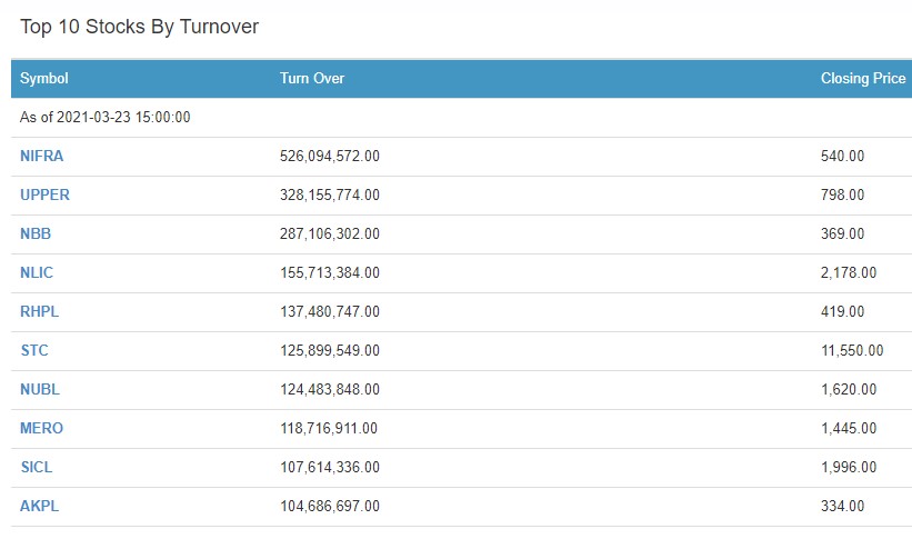 आज निफ्रा, अपर तामाकोशी, नेपाल बंगलादेश बैंक, नेपाल लाइफ इन्स्योरेन्स, रसुवागढी हाईड्रोपावर, साल्ट ट्रेडिङ, निर्धन लघुवित्त, मेरो माईक्रोफाइनान्स र शिखर इन्स्योरेन्स र अरुण काबेली हाईड्रोपावरका लगानीकर्ताले सर्वाधिक कारोबार गरेका छन् ।
