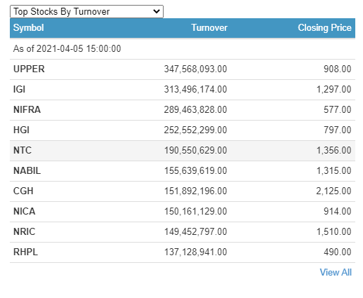 आज निफ्राको २८ करोड ९४ लाख रुपैयाँको शेयर कारोबार भएको छ । आज कम्पनीको शेयर मुल्य ४ रुपैयाँले घटेर ५ सय ७७ रुपैयाँ कायम भएको छ । हिमालयन जनरल इन्स्योरेन्स कम्पनीको २५ करोड २५ लाख रुपैयाँको शेयर कारोबार भएको छ । आज कम्पनीको शेयर मुल्य ६ दशमलव ५५ प्रतिशतले बढेको छ ।