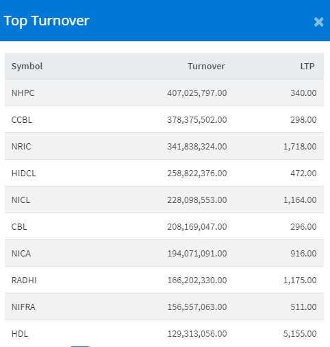 त्यस्तै, नेपाल पुनर्बीमा कम्पनीको ३४ करोड १८ लाख रुपैयाँको शेयर कारोबार भएको छ । कम्पनीको ४९ रुपैयाँले शेयर मुल्य बढेको छ । हाइड्रोइलेक्ट्रिसिटिको एण्ड इन्भेष्टमेन्ट कम्पनीको २५ करोड ८८ लाख रुपैयाँको शेयर कारोबार भएको छ । नेपाल इन्स्योरेन्स कम्पनीको २२ करोड ८० लाख रुपैयाँको शेयर कारोबार भएको छ । सिभिल बैंकको २० करोड ८१ लाख रुपैयाँको शेयर कारोबार भएको छ ।