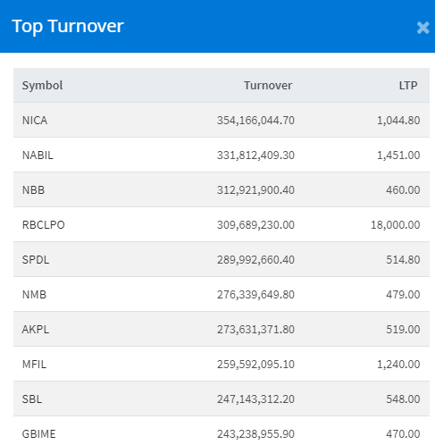 त्यस्तै,नविल बैंकको ३३ करोड १८ लाख रुपैयाँको शेयर कारोबार भएको छ । नेपाल बङलादेश बैंकको ३१ करोड २९ लाख रुपैयाँको शेयर कारोबार भएको छ । राष्ट्रिय बीमा कम्पनी प्रोमोटर शेयरको ३० करोड ९६ लाख रुपैयाँको शेयर कारोबार भएको छ । सिनर्जी पावर कम्पनीको २८ करोड ९९ लाख रुपैयाँको शेयर कारोबार भएको छ ।