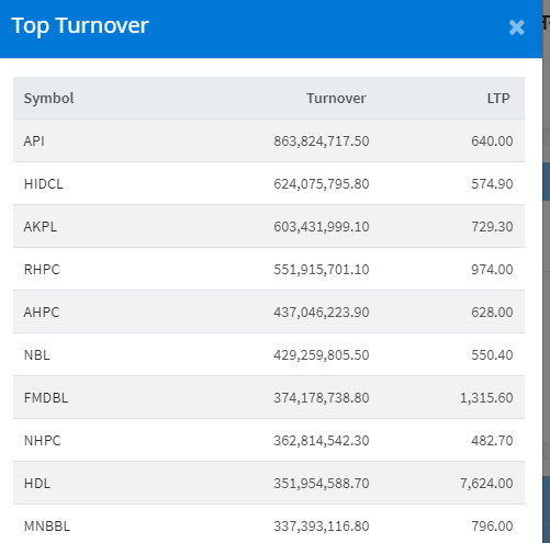 त्यस्तै, हाइड्रोइलेक्टीसिटीको ६२ करोड ४० लाख रुपैयाँको शेयर कारोबार भएको छ । अरुण कावेली पावर कम्पनीको ६० करोड ३४ लाख रुपैयाँको शेयर कारोबार भएको छ । रिडी हाइड्रोपावर कम्पनीको ५५ करोड १९ लाख रुपैयाँको शेयर कारोबार भएको छ । अरुण भ्याली हाइड्रोपावर कम्पनीको ४३ करोड ७० लाख रुपैयाँको शेयर कारोबार भएको छ ।