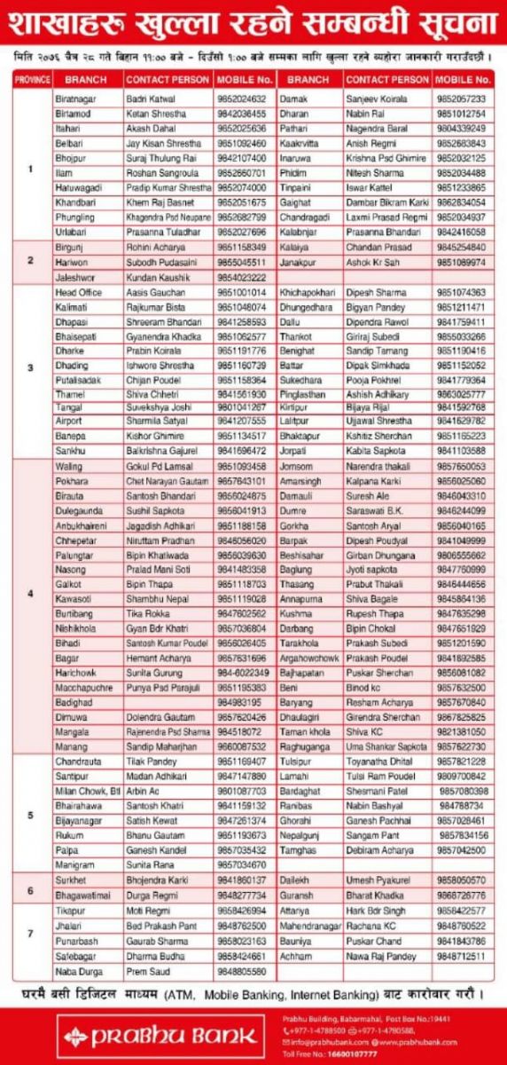 काठमाडौं । प्रभु बैंकको आज उपत्यका भित्र र बाहिर गरी बिभिन्न ठाउँका शाखाहरु खुल्ला रहनेछन् । उक्त शाखाहरु ११ बजेदेखि १ बजेसम्म खुल्ने बताइएको छ ।