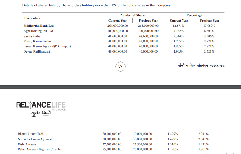 रिलायन्स लाइफमा एक प्रतिशत भन्दा बढी लगानी रहेका आधारभुत शेयरधनीको संख्या १० रहेको छ । सबैभन्दा ठुलो लगानी सिद्धार्थ बैंकको १२.५७१ प्रतिशत रहेको छ । यस पछि दोस्रो ठुलो लगानी अग्नी होल्डिङ प्रा.लिको ४.७६२ प्रतिशत, सविता केडियाको २.३१४ प्रतिशत, मनोज कुमार केडियाको १.९० प्रतिशत, पवन कुमार अग्रवालको पिके इम्पेक्सको नाममा १.९० प्रतिशत, देवराज राजभण्डारीको १.९० प्रतिशत, विराट कुमार तोदीको १.४२ प्रतिशत, नरेन्द्र कुमार अग्रवालको १.४२९ प्रतिशत, ऋषि अग्रवालको १.३१ प्रतिशत र राहुल अग्रवालको १.१९ प्रतिशत लगानी रहेको छ ।
