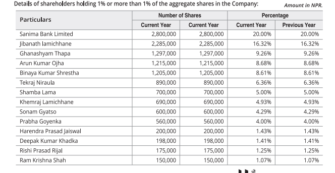 त्यस्तै सानिमा लाइफमा सानिमा बैंकको सबैभन्दा धेरै २० प्रतिशत लगानी रहेको छ । दोस्रो ठुलो लगानी जीवनाथ लामिछानेको १६.३२ प्रतिशत लगानी छ । त्यस्तै एक प्रतिशत भन्दा धेरै लगानी रहेका आधारभुत शेयरधनीहरु घनश्याम थापाको ९.२६ प्रतिशत, अरुण कुमार ओझाको ८.६८ प्रतिशत, विनय कुमार श्रेष्ठको ८.६१ प्रतिशत, टेकराज निरौलाको ६.३६ प्रतिशत, शाम्ब लामाको ५ प्रतिशत, खेमराज लामिछानेको ४.९३ प्रतिशत, सोनम ग्यास्टोको ४.२९ प्रतिशत, प्रभा गोयन्काको ४ प्रतिशत, हरेन्द्र प्रसाद जैसवालको १.४३ प्रतिशत, दिपक कुमार खड्काको १.४१ प्रतिशत, ऋषि प्रसाद रिजालको १.२५ प्रतिशत र रामकृष्ण शाहको १.०७ प्रतिशत लगानी रहेको छ ।