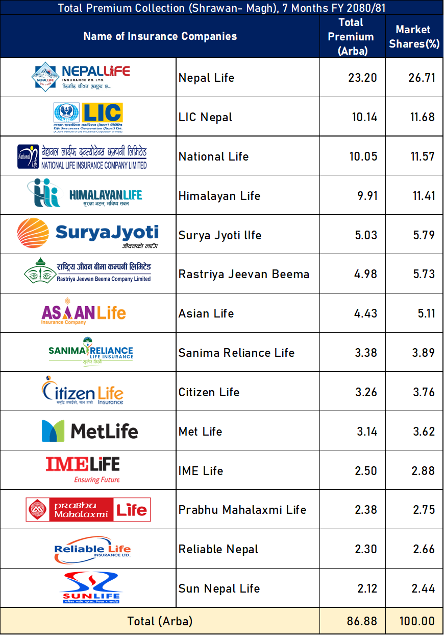 ती कम्पनीमध्ये माघसम्म नेपाल लाइफ इन्स्योरेन्सले सर्वाधिक कुल बीमाशुल्क आर्जन गरेको छ। कम्पनीले २३ अर्ब २० करोड कुल बीमाशुल्क आर्जन गरेको हो। १४ जीवन बीमा कम्पनीमा नेपाल लाइफको बजार हिस्सा २६.७१ प्रतिशत रहेको छ।
